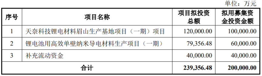 近日,江苏天奈科技股份有限公司公告称,2022年度向特定对象发行A股股票预案,拟募集资金总额不超20亿元(含)用于以下项目:10亿元用于天奈科技锂电材料眉山生产基地项目(一期)项目,6亿元用于锂电池用高效单壁纳米导电材料生产项目(一期),4亿元用于补充流动资金。