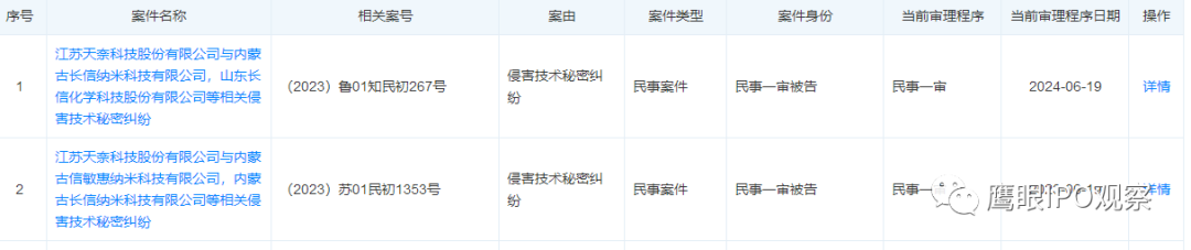 而江苏天奈科技股份有限公司与内蒙古长信纳米科技有限公司,山东长信化学科技股份有限公司等相关侵害技术秘密纠纷【(2023)鲁01知民初267号】的原告也是江苏天奈科技股份有限公司,被告为山东长信化学科技股份有限公司、王佳锐、内蒙古长信纳米科技有限公司,该案也已在6月19日开庭。