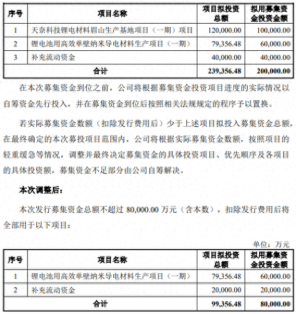其中公司砍去了原计划总投资12亿元、募资额投入10亿元的锂电材料眉山生产基地项目(一期)项目(简称“眉山项目”),并将补充流动资金的募资计划额由4亿元降低至2亿元,仅保留募资投资6亿元的锂电池用高效单壁纳米导电材料生产项目(一期)按原计划未变动。