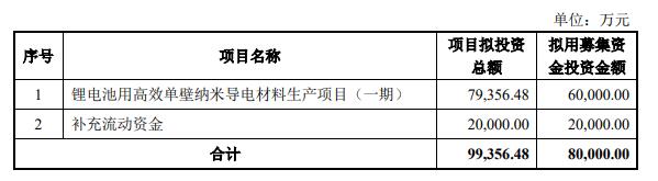 天奈科技于2024年3月2日发布的2022年度向特定对象发行A股股票预案(修订稿)显示,本次向特定对象发行股票募集资金总额不超过80,000.00万元(含本数),扣除发行费用后的募集资金净额计划用于以下项目:锂电池用高效单壁纳米导电材料生产项目(一期)、补充流动资金。