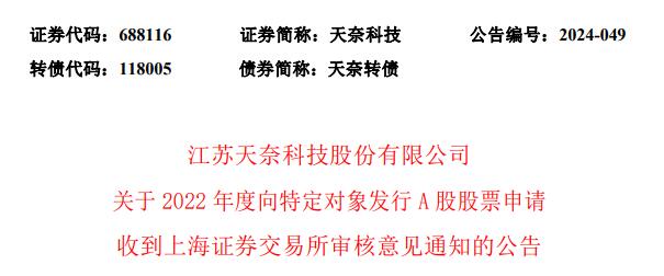 天奈科技(688116.SH)昨晚发布关于2022年度向特定对象发行A股股票申请收到上海证券交易所审核意见通知的公告。天奈科技于近日收到上海证券交易所出具的《关于江苏天奈科技股份有限公司向特定对象发行股票审核意见的通知》,具体意见如下:“江苏天奈科技股份有限公司向特定对象发行股票申请符合发行条件、上市条件和信息披露要求,本所将在履行相关程序并收到你公司申请文件后提交中国证监会注册。”