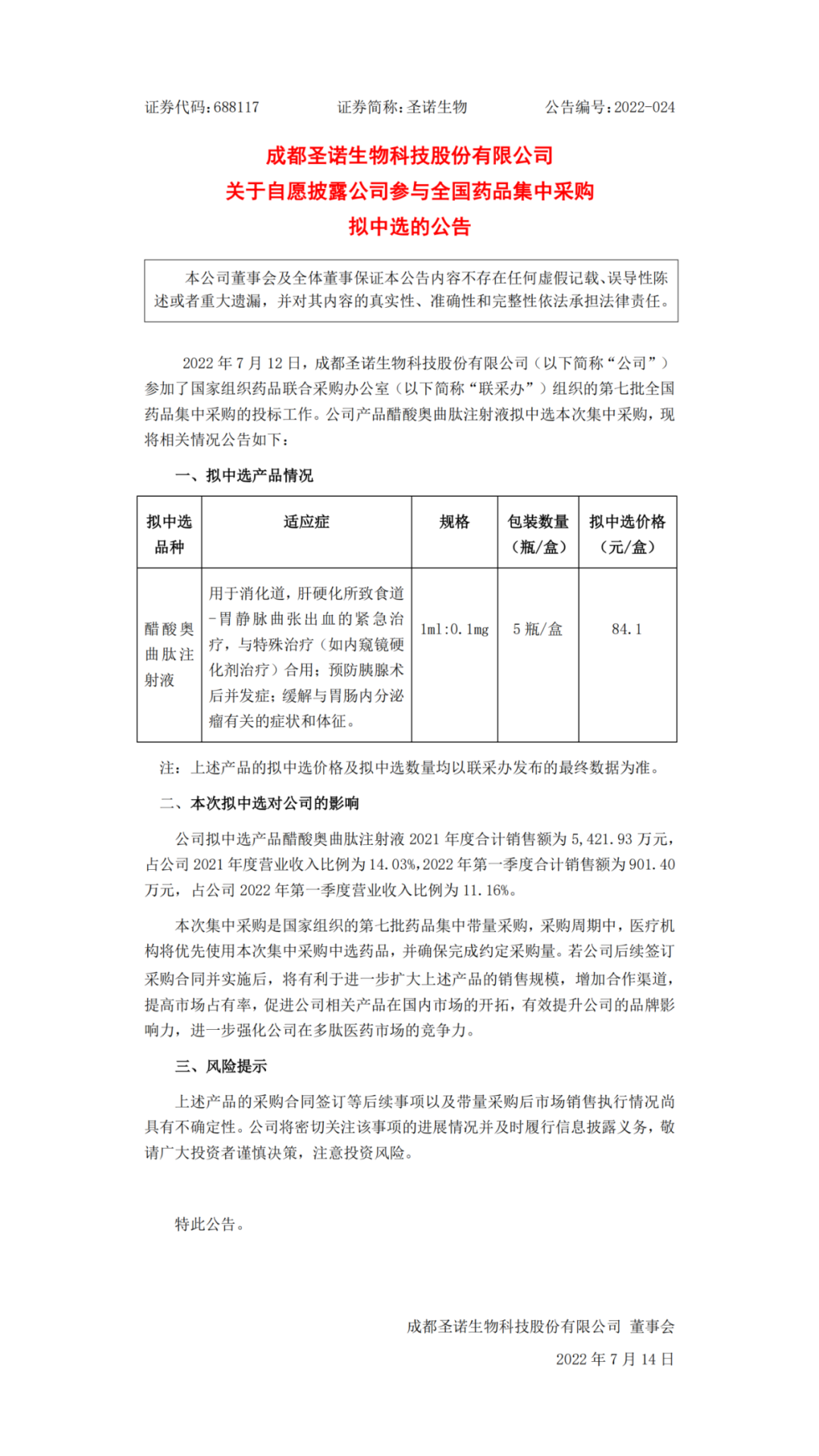 圣诺生物所生产的醋酸奥曲肽注射液拟中选本次集中采购。