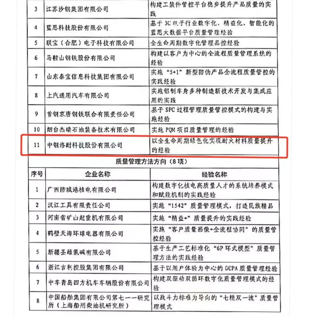 10月19日,中国质量协会公布了2022年度全国质量标杆名单,中钢洛耐科技股份有限公司申报的《以全生命周期绿色化实现耐火材料质量提升的经验》被评为全国质量标杆典型经验。