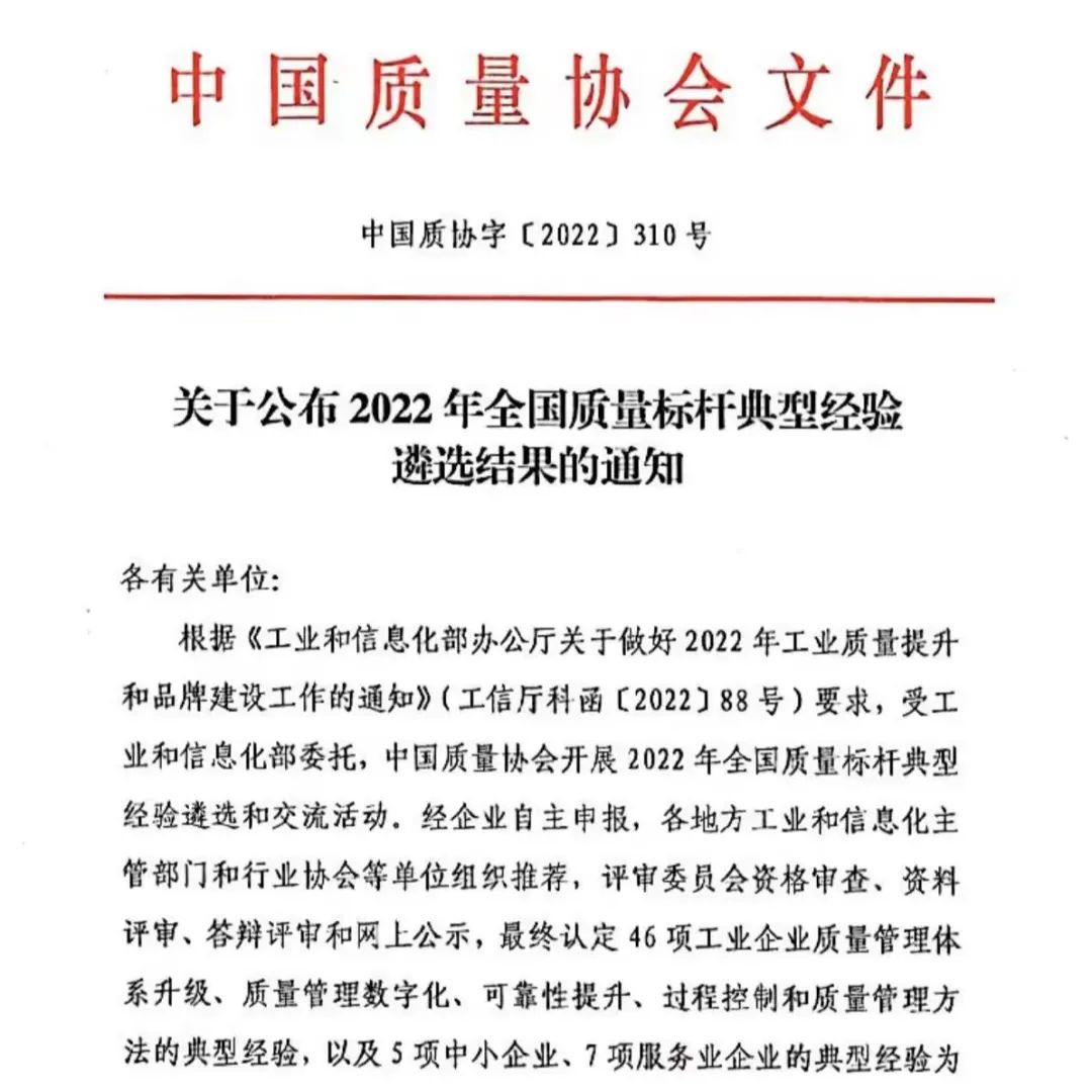 “全国质量标杆”是由工信部主导、中国质量协会具体组织的全国性质量奖项,上榜企业代表着全国范围内质量管理的先进水平,更为行业提供了质量管理典型经验的参考和示范。