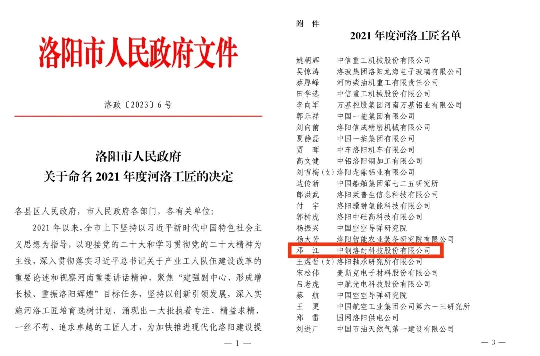 近日,洛阳市人民政府发布《关于命名2021年度河洛工匠的决定》,全市50名同志被命名“河洛工匠”,中钢洛耐公司镁质分厂焙烧班大班长邓江榜上有名。