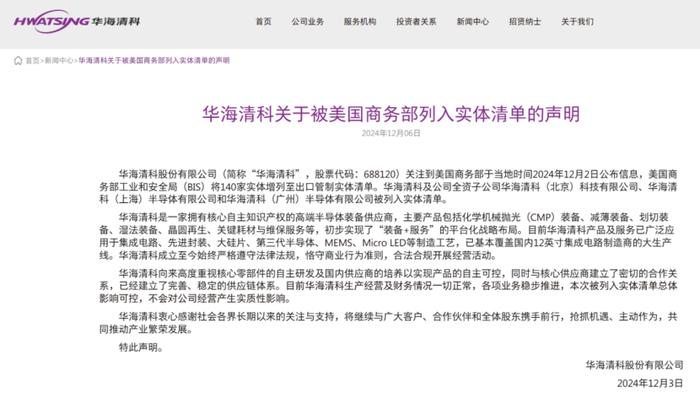 今年12月初,美国对华半导体出口管制措施的新规中,增列140家实体。其中,华海清科及公司全资子公司华海清科(北京)科技有限公司、华海清科(上海)半导体有限公司和华海清科(广州)半导体有限公司均被列入实体清单。
