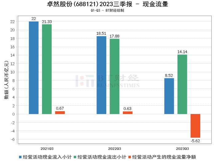 在现金流量方面,卓然股份2023年三季度的经营活动产生的现金流量净额为-5.62亿元,较上年同期的6262.24万元大幅下滑。经营活动现金流入小计为8.52亿元,较上年同期的18.51亿元大幅减少。经营活动现金流出小计为14.14亿元,较上年同期的17.88亿元有所减少。
