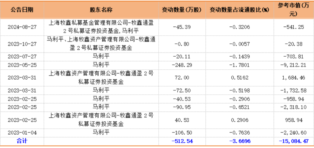 连带着其余几次减持动作,马利平和牧鑫基金合计减持了512.54万股,参考市值超过1.5亿元。