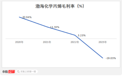 而丙烯的市场行情却并不乐观,生产厂商亏钱卖货。拿渤海化学(600800.SH)来说,其毛利率在2023年已经为负19.03%,相较2020年差出了近40个百分点。