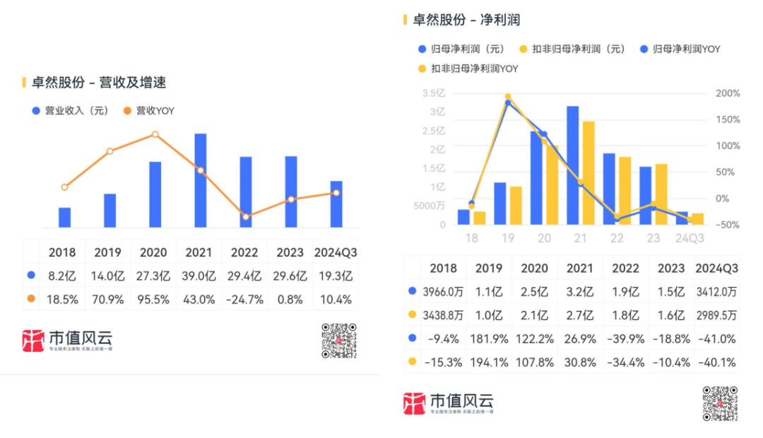 收入端虽能维稳,但归母净利润已经连降近3年,从2021年高点3.2亿降至2023年的1.5亿,缩水了一半以上,今年前三季度3,412万,更是将同比降幅提升到41%。