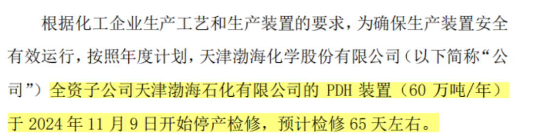 渤海化学在今年11月也披露,全资子公司天津渤海石化有限公司的60万吨/年PDH装置于11月9日开始停产检修,预计检修65天左右。而在去年11月,渤海化学PDH装置停产检修的时间为45天。