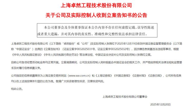 12月20日,卓然股份发布公告披露,公司于2025年12月19日收到上海证监局出具的《关于对上海卓然工程技术股份有限公司采取责令改正措施并对张锦红、吴玉同、张笑毓采取出具警示函措施的决定》(以下简称《决定书》)。