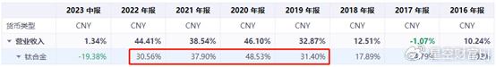 从过往数据来看,2016、2017年,西部超导钛合金收入增长只有1.02%、4.79%。而近几年国家对军用飞机的需求旺盛,西部超导基本维持了30%以上的收入增速。但是2023年上半年,钛合金收入掉头向下,同比降幅高达19.38%(由于宝钛股份业绩难以区分军工和民用,因此主要以西部超导数据为例,下同)。
