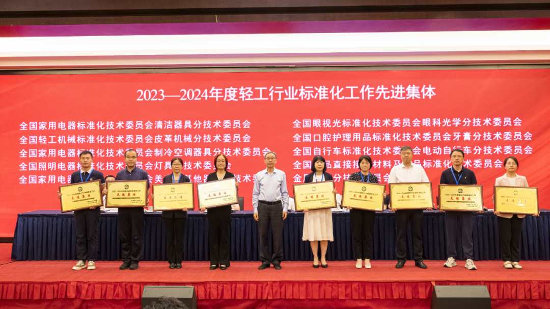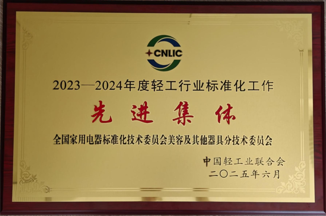 6月27日,由中国轻工业联合会举办的2025年全国轻工行业标准化工作会议在北京召开。中国电器科学研究院股份有限公司(以下简称“中国电研”)归口的全国家用电器标委会美容及其他器具分委会(SAC/TC46/SC6),荣获“2023-2024年度全国轻工行业标准化工作先进集体”称号。