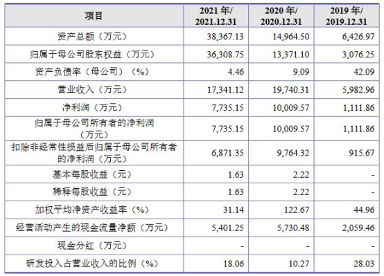 2019年至2021年,晶华微营业收入分别为5,982.96万元、19,740.31万元、17,341.12万元,归属于母公司所有者的净利润分别为1,111.86万元、10,009.57万元、7,735.15万元,扣除非经常性损益后归属于母公司所有者的净利润915.67万元、9,764.32万元、6,871.35万元,经营活动产生的现金流量净额2,059.46万元、5,730.48万元、5,401.25万元。