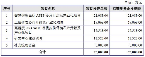 晶华微本次发行募集资金总额104,798.72万元,扣除发行费用(不含税)后,募集资金净额为92,053.70万元。晶华微最终募集资金净额比原计划多17,053.70万元。2022年7月26日公司发布的招股书显示,拟募集资金75,000.00万元,分别用于智慧健康医疗ASSP芯片升级及产业化项目、工控仪表芯片升级及产业化项目、高精度PGA/ADC等模拟信号链芯片升级及产业化项目、研发中心建设项目、补充流动资金。