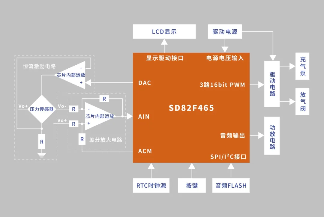 杭州晶华微电子提供的SD82F465血压计方案,内部运放与传感器构成恒流激励源,大幅降低传感器温漂影响,使测量信号更准确。