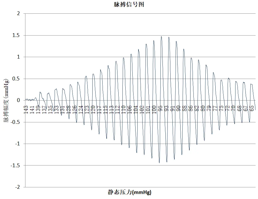 示波法又叫振荡法,是一种通过检测血液流动时碰撞血管壁产生的振动来判定血压,查找源于血管壁的搏动包迹,并根据包迹与动脉血压之间的关系,得到血压值的方法。血压计测量到的是一条叠加了振荡脉搏信号的递减的压力曲线(图1左),脉搏波(图1右)幅度最大的点所对应的静态压力即为平均动脉压,这些成对的袖带压力值与相应的袖带压力振荡脉搏波被记录,通过一定的数学算法,最终得出收缩压及舒张压。