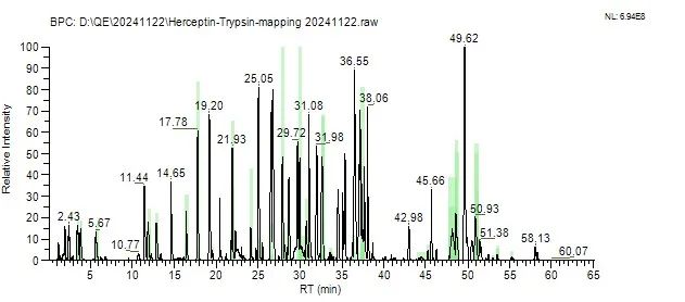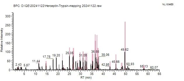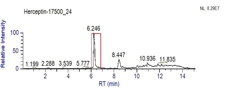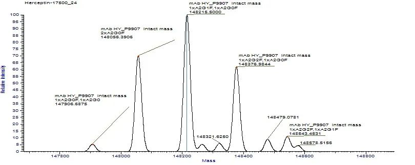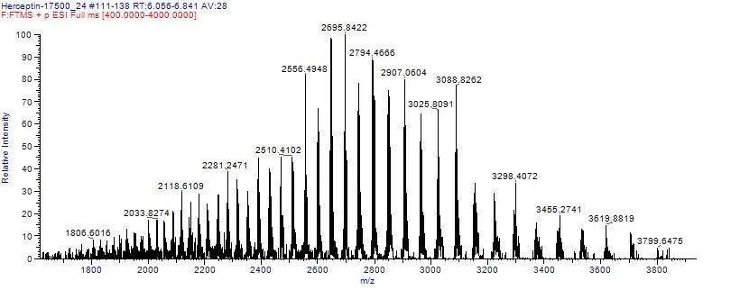 高分辨质谱Q Exactive Orbitrap得到抗体蛋白的多电荷信号,经 BioPhama Finder 软件解卷积分析,可获得精确分子量数值,也可初步判断蛋白的糖型修饰等信息。