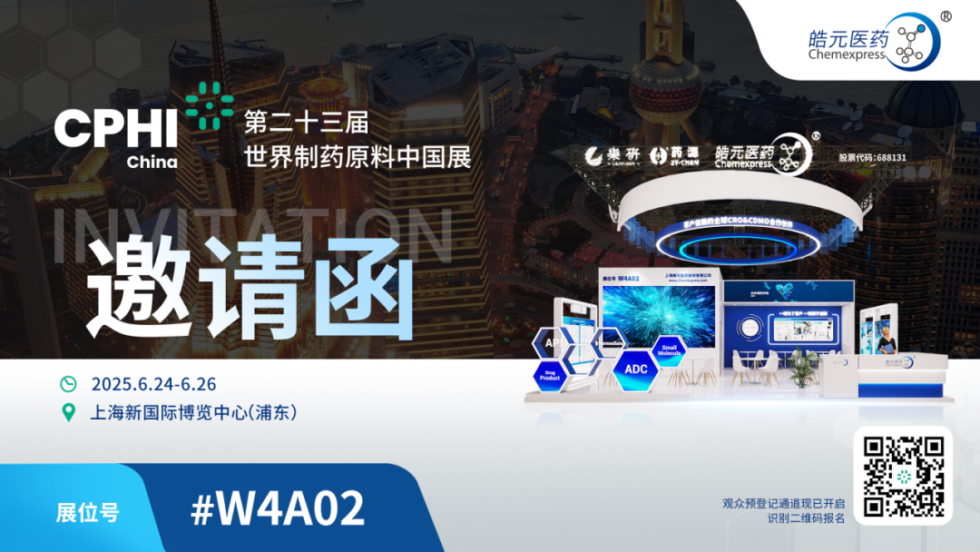 2025年6月24-26日,CPHI China(第二十三届世界制药原料中国)将于上海新国际博览中心举办。作为引领中国医药产业走向世界的“名片”,CPHI China,以全球化视角、专业深度及差异化优势为基石稳居行业领军地位。2025年,展会总面积将突破23万平方米,吸引来自全球的3,500余家国内外标杆企业及100,000余人次海内外观众共襄盛会。皓元医药始终将创新作为核心驱动力,以“产品+服务”模式,聚焦差异化发展,致力于打造覆盖药物研发及生产“起始物料-中间体-原料药-制剂”的一体化服务平台,期待与您相约CPHI China 2025。