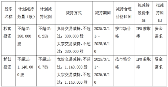 公司近日收到股东分别出具的告知函,因资金需求,股东南通杉富股权投资合伙企业(有限合伙)(以下简称“杉富投资”)拟通过集中竞价或大宗交易方式减持其所持有的公司股份,合计减持数量不超过380,000股,即不超过公司总股本的0.25%;股东深圳市福田区杉创中小微股权投资基金合伙企业(有限合伙)(以下简称“杉创投资”)拟通过集中竞价或大宗交易方式减持其所持有的公司股份,合计减持数量不超过1,140,000股,即不超过公司总股本的0.75%。其中,拟通过集中竞价方式减持的,上述股东均自公告披露之日起15个交易日后的3个月内进行;拟通过大宗交易方式减持的,上述股东自公告披露之日起15个交易日后的3个月内进行。
