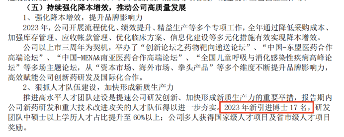数据显示,2023年公司新引进博士17名,2022年公司的博士数量为25名,然而公司2023年年报披露的博士数量却只有20名。换言之,虽然引进了17名博士,但是2023年有22名博士离开了公司,也就是说在引进了17名博士后在2023年有一半的博士离开了科兴制药。
