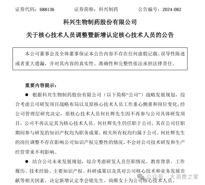 终止人干扰素α2b喷雾剂临床试验的同日,科兴制药还公告更替了核心技术人员。原核心技术人员何社辉不再担任该职务,但仍任职于公司。