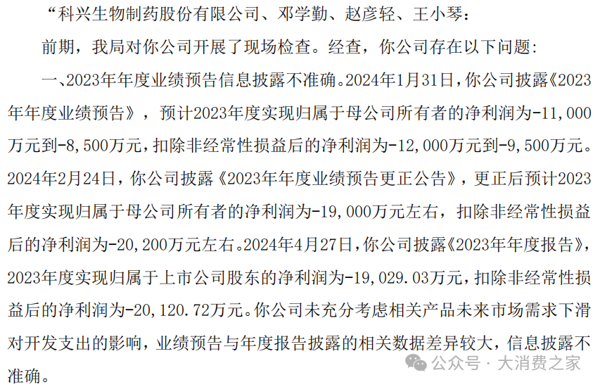 根据公司此前公告,2024年1月31日,科兴制药披露《2023年年度业绩预告》,预计2023年度实现归母净利润为-11,000万元到-8,500万元。不料到了2024年2月24日,公司披露《2023年年度业绩预告更正公告》,更正后预计2023年度实现归母净利润为-19,000万元,亏损额几乎翻了一倍,与前者存在重大差异,也因信息披露不准确遭到了证监会的处罚。