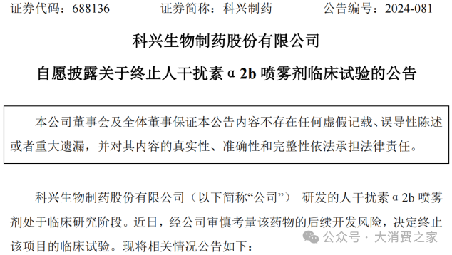 根据科兴制药公告,关于决定终止该项目临床试验的原因,公司表示人干扰素α2b喷雾剂项目目前仅完成临床1期,属于较为早期的临床阶段,后续开展2期和3期临床研究仍需要较大研发投入。截至2024年9月30日,公司人干扰素α2b喷雾剂项目研发投入累计1,918.64万元。