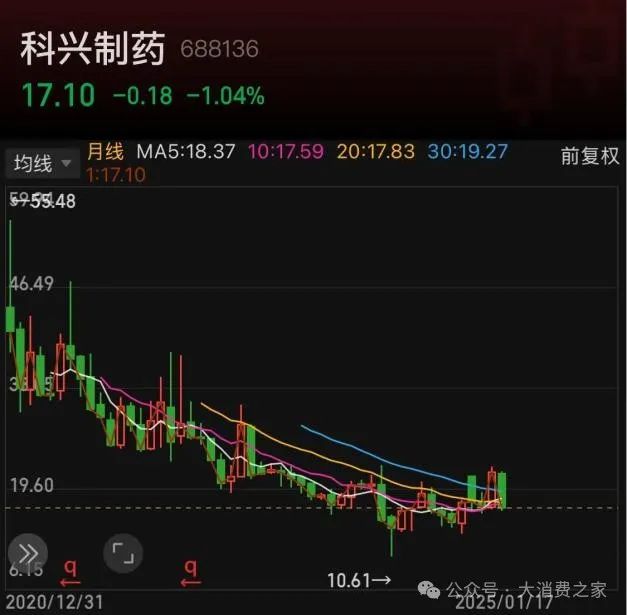 从科兴制药的长期股价走势来看,公司从2020年12月上市后,历史最高价就定格在IPO当月,之后几乎一直处于下降通道,截至公司发布2024年业绩预告时,股价已跌至17.10元/股,从最高点滑落超过60%,市值仅剩34.14亿元。