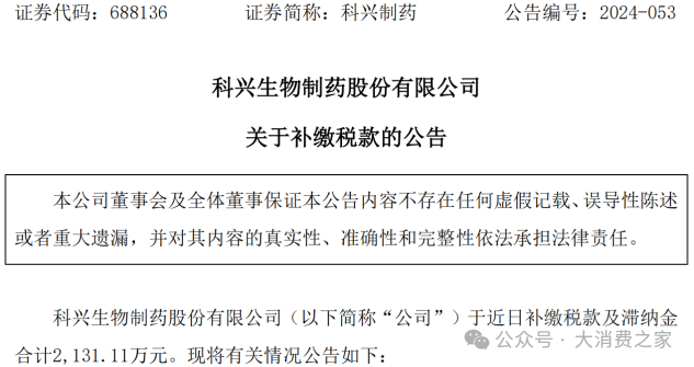 根据科兴制药的另一则公告信息,由于欠缴2021年企业所得税,2024年被税务稽查发现,公司只得补缴了所欠税款,并缴纳了高额滞纳金,金额合计2,131.11万元,且该笔支出由于不符合税前扣除的条件,将直接全额减少公司2024年的净利润。