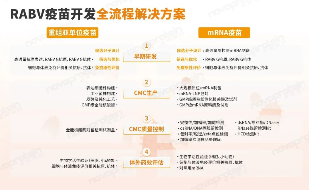 近岸蛋白以创新的蛋白原料和完善的服务为基础,为人用或兽用狂犬病毒重组亚单位疫苗和mRNA疫苗研发提供全流程解决方案。