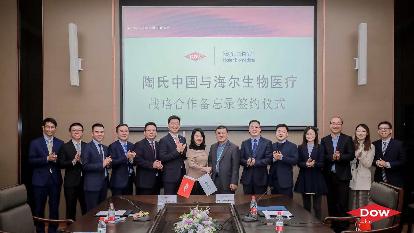 【上海,2021年11月8日】今日,陶氏中国与全球领先的物联网生物安全解决方案服务商,青岛海尔生物医疗股份有限公司,于第四届中国国际进口博览会(CIIE 2021)上签署战略合作协议谅解备忘录,双方将进一步深化在生物医疗冰箱冷柜领域的合作,建立长期全面的战略合作伙伴关系。陶氏公司聚氨酯事业部亚太区产品总监徐慧和海尔生物医疗采购总监邢志涛等双方公司高管出席了此次签约仪式,共同见证双方的合作。