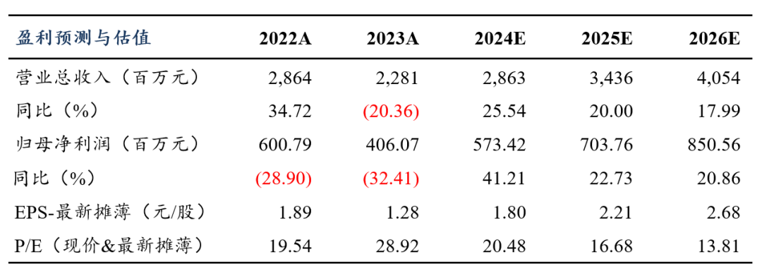 盈利预测与投资评级:考虑到公司Q1业绩超预期兑现且Q2有望进一步迎来拐点,我们将公司2024-2026年营收预期由27.04/32.54/38.54亿元调整为28.63/34.36/40.54亿元,归母净利润由5.02/6.25/7.59亿元调整为5.73/7.04/8.51亿元,当前股价对应PE分别为20/17/14×,维持“买入”评级。