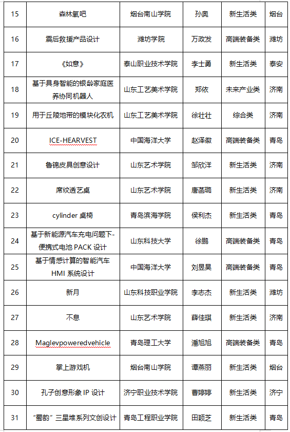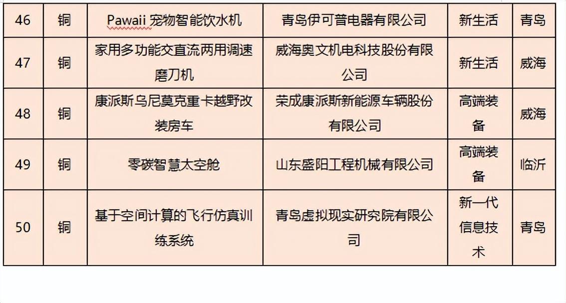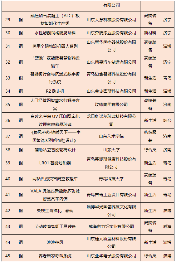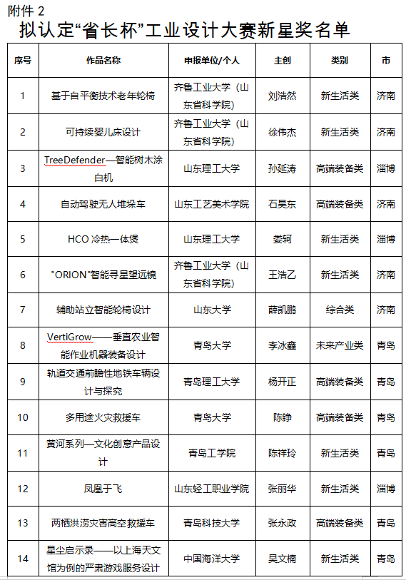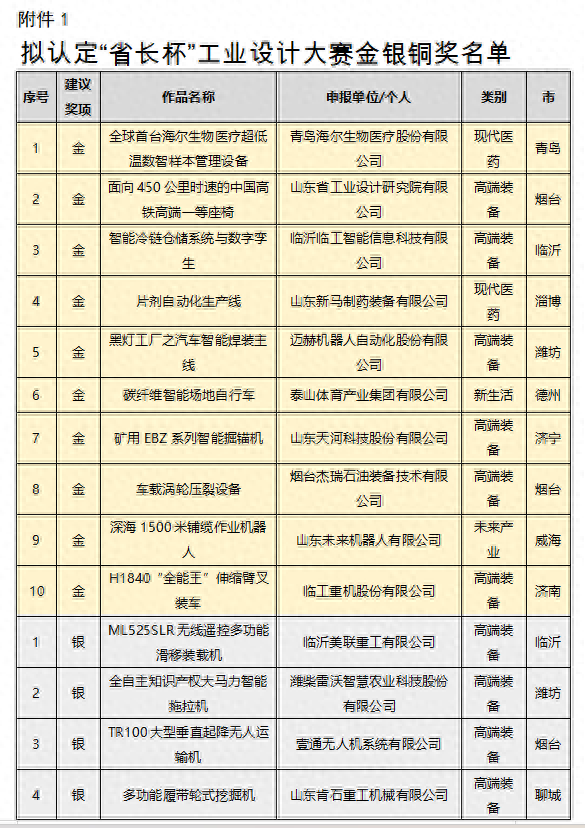 8月26日,山东省工业和信息化厅发布公示信息称,根据《山东省第五届“省长杯”工业设计大赛及山东工业设计周工作方案》的工作安排,经初赛、复赛、决赛各轮专家组线上线下评审,拟认定青岛海尔生物医疗股份有限公司的全球首台海尔生物医疗超低温数智样本管理设备等10件作品为大赛金奖;壹通无人机系统有限公司的TR100大型垂直起降无人运输机等20件作品为大赛银奖;中车山东风电有限公司的陆上7.XMW大功率风力发电装备等50件作品为大赛铜奖;齐鲁工业大学(山东省科学院)的基于自平衡技术老年轮椅等50件作品为大赛新星奖。