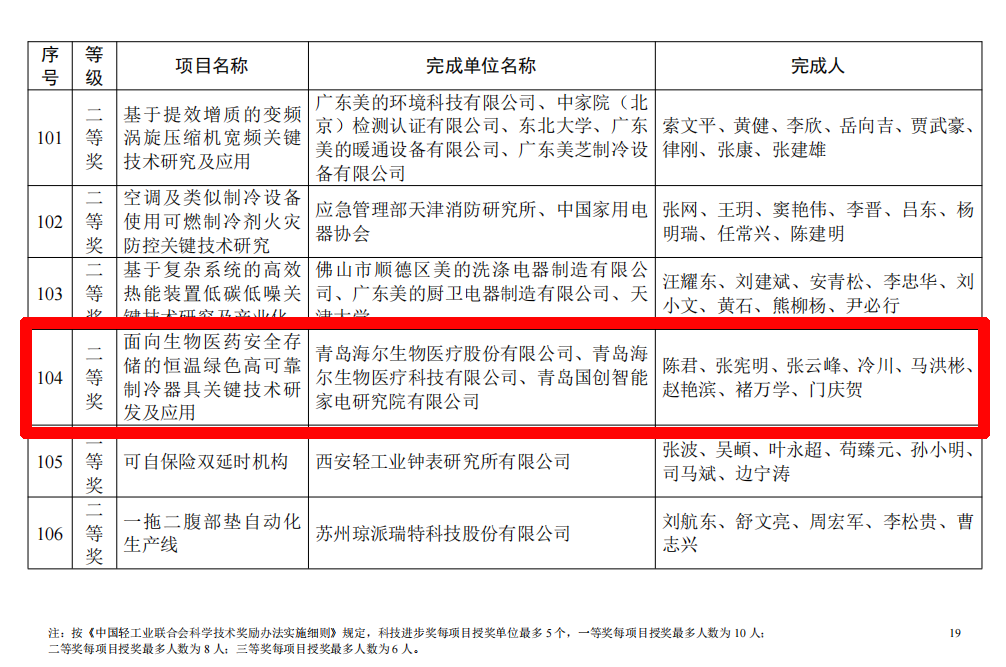 近日,海尔生物医疗的《面向生物医药安全存储的恒温绿色高可靠制冷器具关键技术研发及应用》荣获2024年度中国轻工业联合会科技进步奖二等奖。