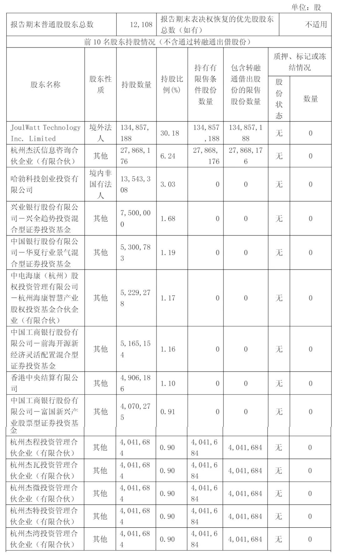 截至2025年3月31日,JoulWatt Technology持股为30.18%,杭州杰沃信息咨询合伙企业(有限合伙)持股为6.24%,华为旗下哈勃科技创业投资有限公司持股为3.03%,兴业银行股份有限公司-兴全趋势投资混合型证券投资基金持股为1.68%,中国银行股份有限公司-华夏行业景气混合型证券投资基金持股为1.19%;