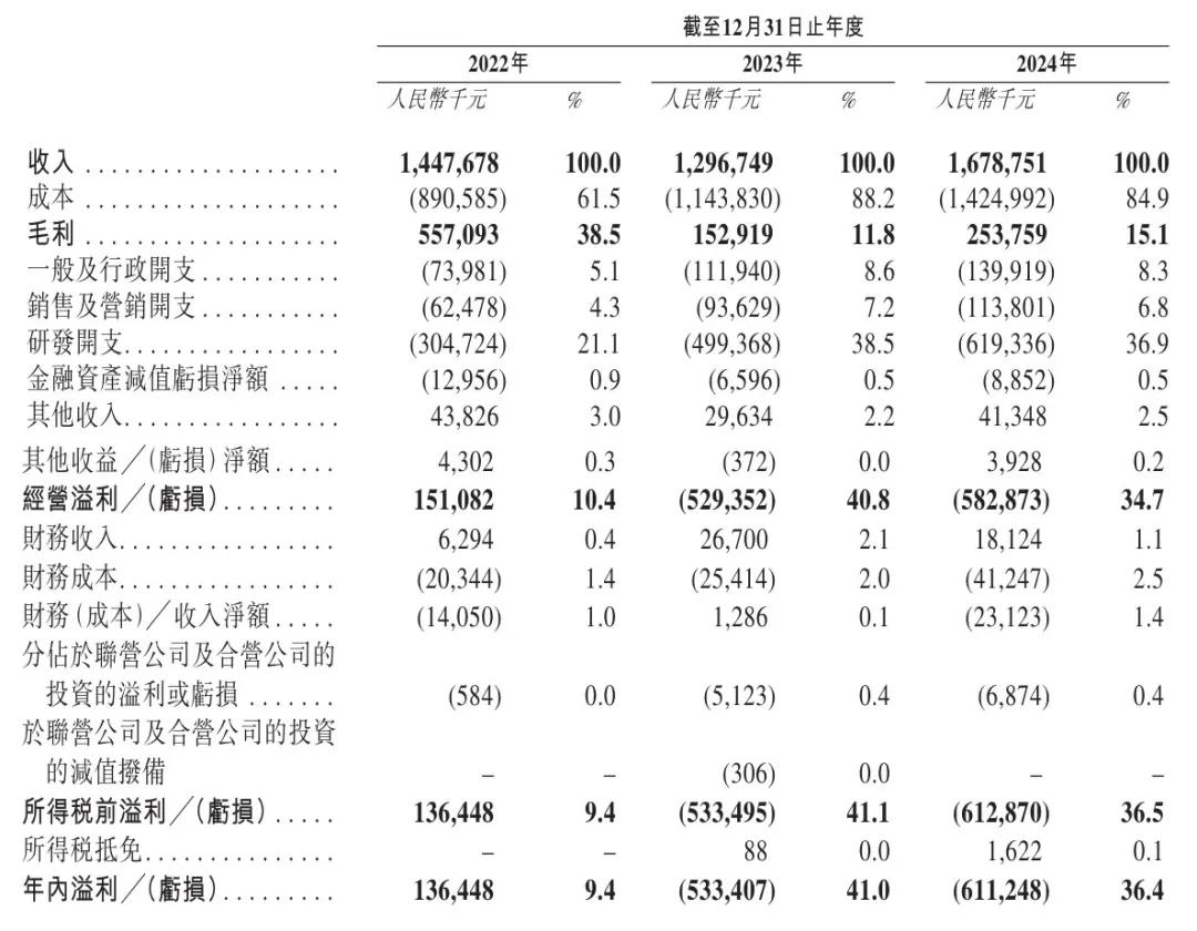 杰华特2022年、2023年、2024年经营利润分别为1.51亿元、-5.29亿元、-5.83亿元;期内利润分别为1.36亿元、-5.33亿元、-6.11亿元;年内盈利率分别为9.4%、-41%、-36.4%。