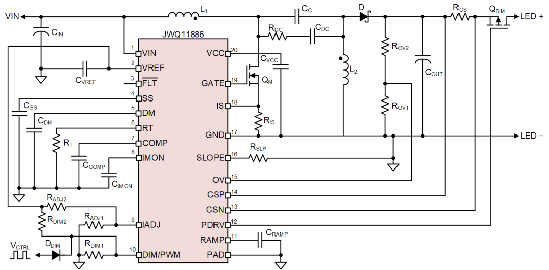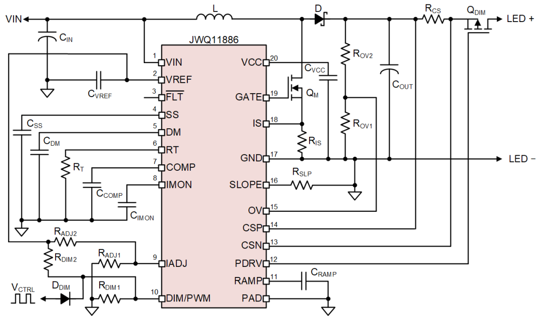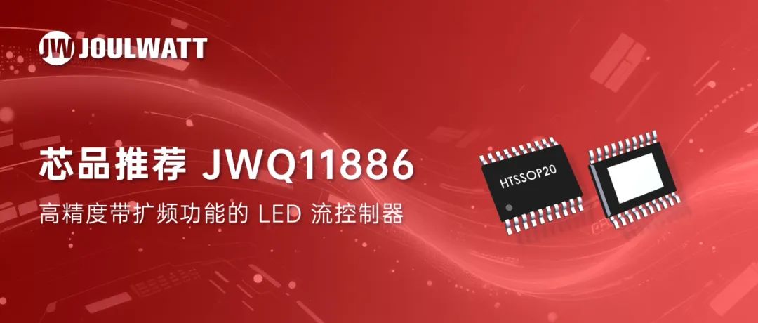 JWQ11886采用HTSSOP-20的底部散热封装,具备出色的热性能与完善的故障诊断与保护机制。芯片集成了过热保护、输入欠压、可配置的输出过压保护、输出过流保护、输出欠压保护、逐周期电流限制,以及输出电流监控实现LED开路、短路检测,保障系统的安全运行。