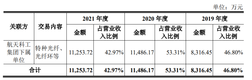 2019-2021年,长盈通关联销售金额分别为8316.45万元、1.15亿元、1.12亿元,占营收的比例分别为46.8%、53.31%、42.97%。