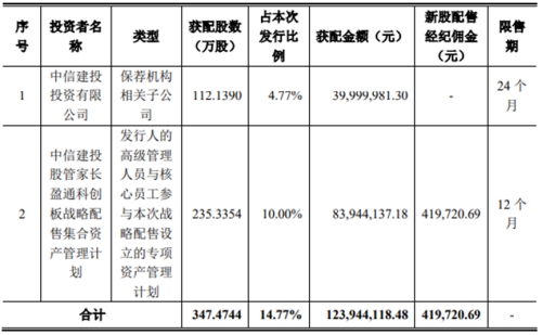 长盈通本次公开发行股票数量为2,353.3544万股,最终战略配售股数为347.4744万股,占本次发行数量的14.77%。保荐机构依法设立的相关子公司中信建投投资有限公司(以下简称“中信建投投资”)在本次发行中获配112.1390万股;中信建投股管家长盈通科创板战略配售集合资产管理计划(公司的高级管理人员与核心员工参与本次战略配售设立的专项资产管理计划,以下简称“长盈通战配资管计划”)最终获配股票数量为235.3354万股。本次发行最终战略配售结果如下: