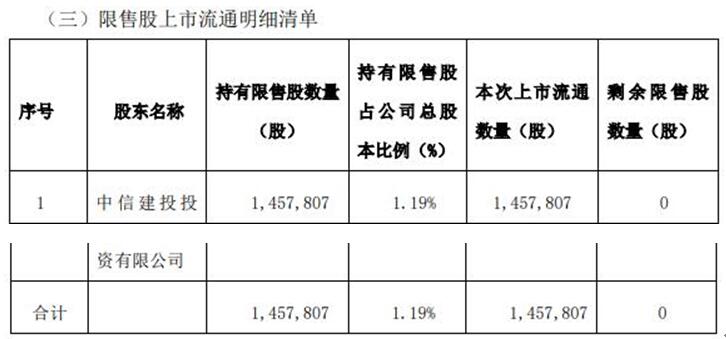 本次上市流通的限售股为公司首次公开发行部分战略配售限售股,共涉及限售股股东数量为1名,股东为中信建投投资有限公司。