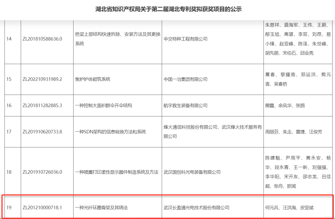 近日,第二届湖北专利奖评选结果正式揭晓。该奖项由湖北省政府设立,是全省知识产权领域最高荣誉之一,每五年评选一次,每届获奖专利数量严格控制在45项以内。武汉长盈通光电技术股份有限公司凭借核心专利《一种光纤环圈骨架及其绕法》,从众多创新成果中脱颖而出,斩获这项省级权威奖项!