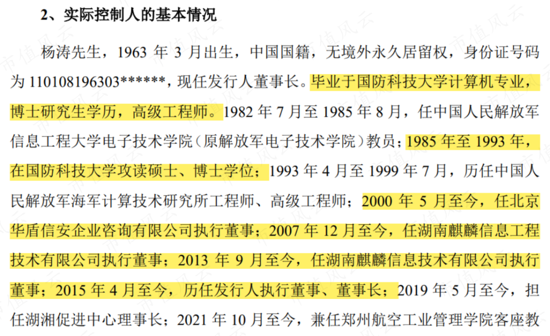 2007年,长沙银河、中标软件、长沙软件园、北京华盾四方共同设立湖南麒麟信息工程技术有限公司(简称:“麒麟工程”)。其中,长沙银河隶属国防科大计算机学院的全民所有制企业,中标软件是中国软件的子公司,北京华盾则由麒麟信安的实控人杨涛控制。
