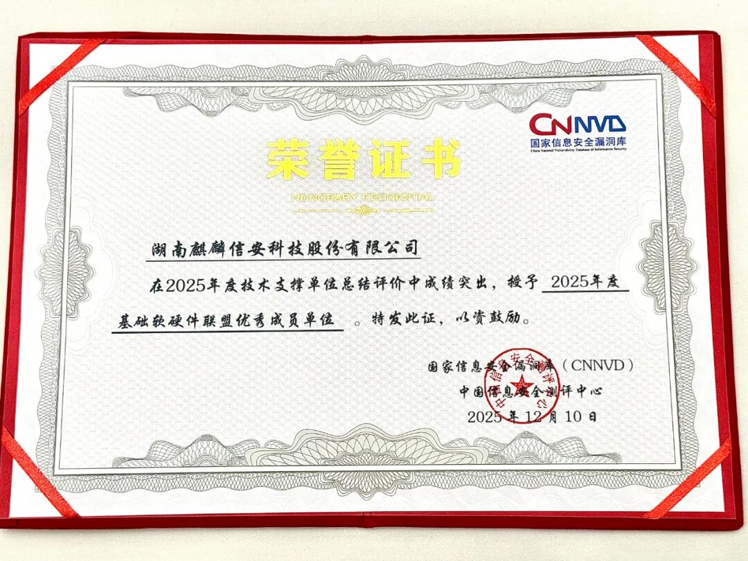 国家信息安全漏洞库(CNNVD)是由 中国信息安全测评中心 建设运维的国家级漏洞数据管理平台,切实履行漏洞分析和风险评估职能,为重要行业和关键基础设施安全提供技术支撑和数据支持。获此殊荣,是CNNVD对 麒麟信安 在漏洞治理领域成效的高度肯定,公司将持续推动漏洞管理工作规范化、标准化,积极分享漏洞治理实践经验,助力行业整体漏洞防控能力提升。