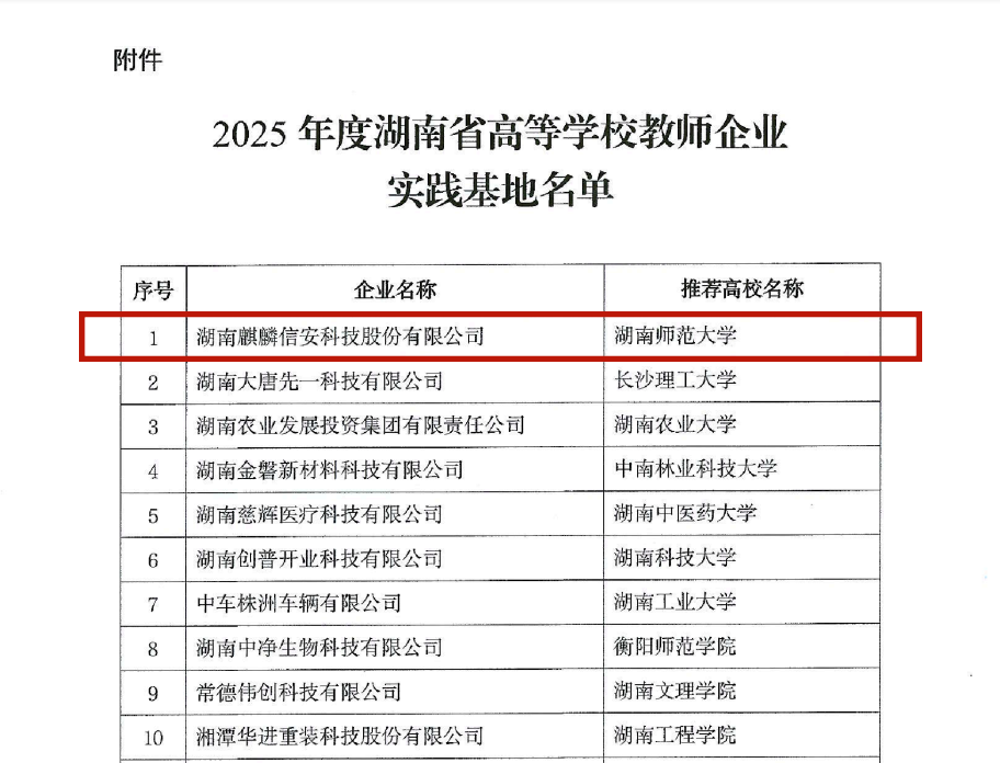 近日,湖南省教育厅等部门联合发布“2025年度湖南省高等学校教师企业实践基地名单”,经高校推荐、专家综合评审等环节,麒麟信安成功入选。该名单旨在贯彻落实《湖南省高等院校学科专业优化实施方案》,推进产教深度融合,强化校企协同育人,着力培养更加适应我省经济社会发展和产业转型升级需要的高素质复合型人才。