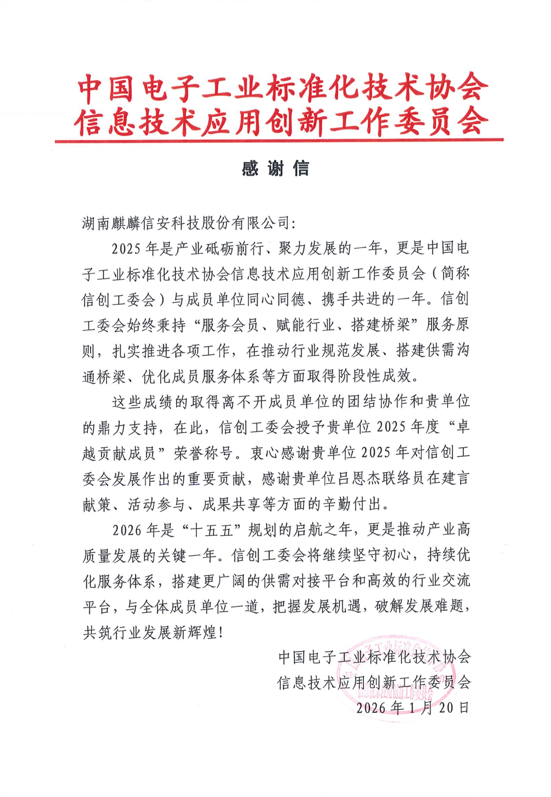 与此同时,麒麟信安还收到了来自信创工委会的感谢信。信中对公司2025年度的工作给予了高度评价,充分肯定麒麟信安在贯彻工委会“服务会员、赋能行业、搭建桥梁”宗旨中所给予的鼎力支持,为信创行业高质量发展作出了积极贡献。