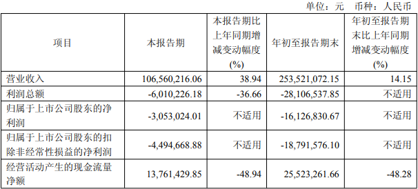 路德科技(688156.SH)日前发布的2025年第三季度报告显示,今年前三季度,公司实现营业收入2.54亿元,同比增长14.15%;归属于上市公司股东的净利润-1612.68万元;归属于上市公司股东的扣除非经常性损益的净利润-1879.16万元;经营活动产生的现金流量净额2552.33万元,同比减少48.28%。
