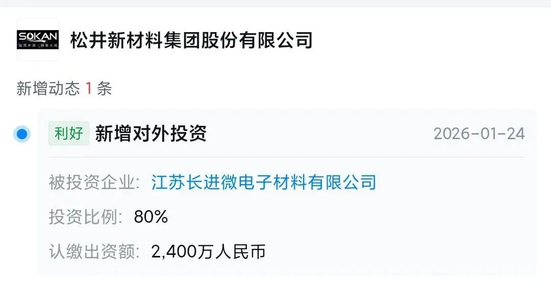 2026年1月24日,天眼查监测到的一则企业变更信息引起了《涂料经》记者的注意——信息显示:松井新材料集团股份有限公司(证券代码:688157.SH,证券简称:松井股份)新增对外投资,被投资企业为江苏长进微电子材料有限公司(简称“长进微电子”),投资比例80%,认缴出资额2400万元。
