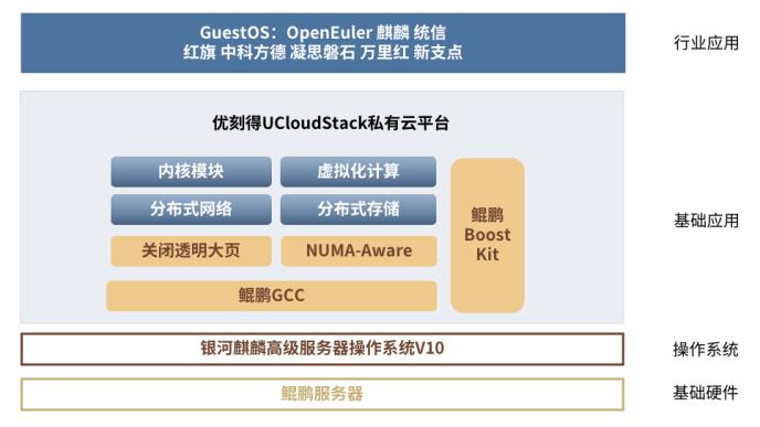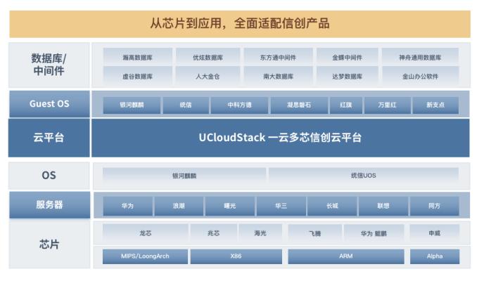 UCloudStack私有云平台从芯片到应用进行了全面的适配,CPU已完成鲲鹏、飞腾、海光、龙芯、兆芯、申威主流国产芯片的适配,宿主机层面也已实现银河麒麟和统信等国产操作系统的全面兼容。